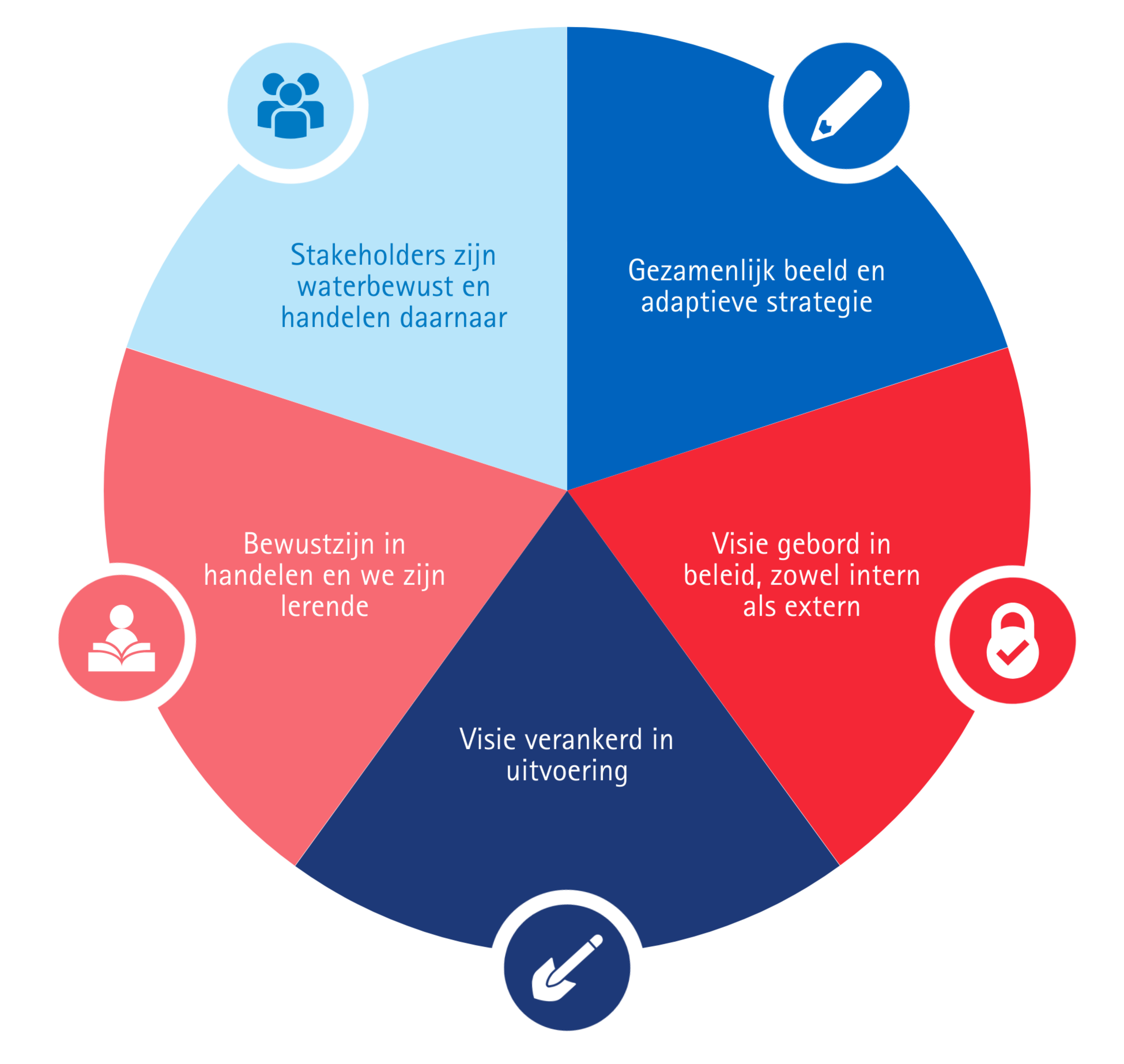 Dit dashboard laat zien hoe HDSR werkt aan een klimaatbestendig gebied en watersysteem. Belangrijk, want we merken allemaal dat het klimaat verandert: hogere temperaturen, een sneller stijgende zeespiegel, nattere winters, heftigere buien en kans op drogere zomers. Met het programma Klimaatadaptatie werken we aan onze ambitie: wij als waterschap en onze partners zijn goed voorbereid op een veranderend klimaat. Een visie en strategie moeten ons richting geven om met elk toekomstig klimaat om te gaan. Het programma Klimaatadaptatie werkt aan deze ambitie via de vijf strategische doelen die je hiernaast ziet. Doel van het programma is dat klimaatadaptatie onderdeel is van alle relevante, reguliere werkprocessen.